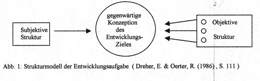 Im Modell der Entwicklungsaufgaben bestimmt und determiniert das Individuum das Entwicklungsziel selbst, dieses Ziel ist jedoch nicht das Ergebnis des unabhängigen freien Denkens des Individuums, sondern wird entsprechend wesentlicher Merkmale der Umgebung strukturiert ( in der Abbildung durch die Pfeile von der objektiven Struktur zu der Konzeption des Entwicklungszieles symbolisiert).