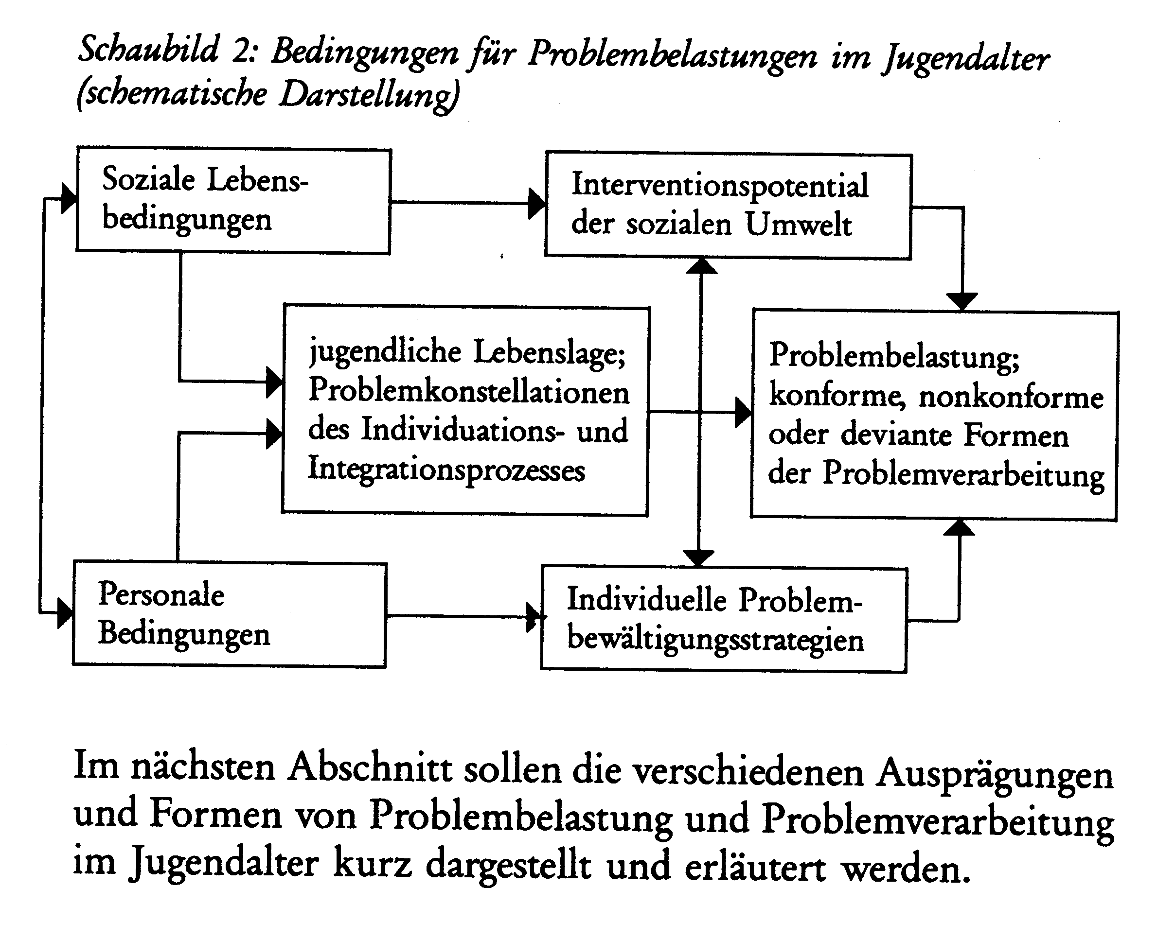 Sozioökonomisch benachteiligte Lebensbedingungen führen eindeutig häufiger zu motivationalen und kognitiven Persönlichkeitsmerkmalen, die eine nur passive und ineffektive Problembewältigung ermöglichen. Aus dem Mißverhältnis zwischen situativen Anforderungen einerseits und eigenen Handlungskompetenzen, Problembewältigungsmöglichkeiten und Unterstützungserfahrungen andererseits entwickelt der Jugendliche untaugliche Lösungen, die in ihren Erscheinungsformen und Folgen für die soziale Umwelt inakzeptabel sind.