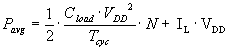 wobei Pavg die mittlere Verlustleistung, Cload die Ausgangskapazität, VDD die Versorgungsspannung, Tcyc die globale Taktperiodendauer, N die Anzahl der Zustandsänderungen des Ausgangs pro Taktzyklus und IL die Leckströme darstellt. Alle Parameter außer N sind direkt durch die Technologie der Schaltung vorgegeben. N hängt sowohl von der logischen Schaltung als auch von der Sequenz der Zustände der Eingangsleitungen ab.